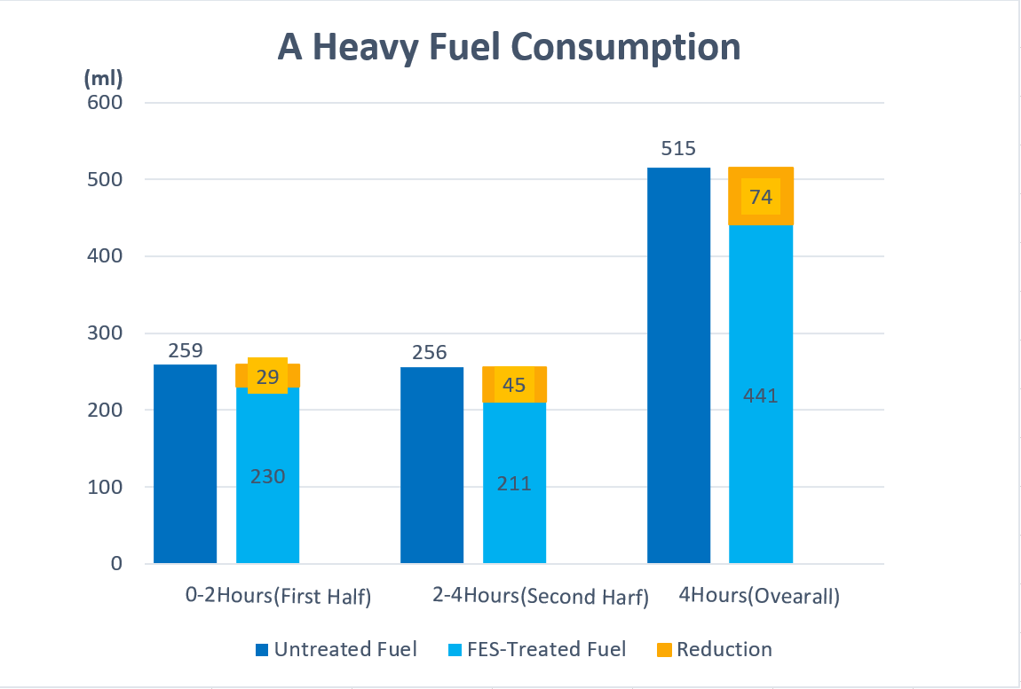 Under identical operating conditions, fuel consumption was compared between A heavy oil processed through FES and conventional A heavy oil.